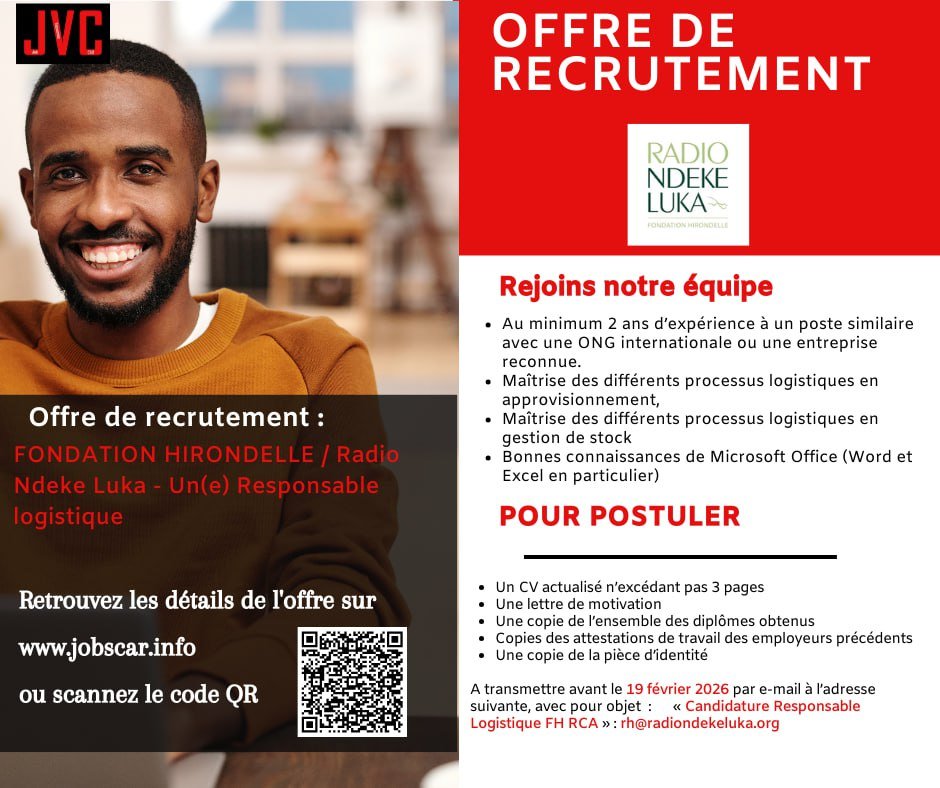 Pages vues 339 942FONDATION HIRONDELLE / Radio Ndeke Luka - Un(e) Responsable logistiqueBangui, Temps pleinAfficherMédecins Sans Frontières - RESPONSABLE DE LA PHARMACIE PROJETBangui, Temps pleinAfficherCICR - Superviseur-euse des opérateurs radioBangui, Temps pleinAfficherAFEB - Officier ProtectionRafai/Birao, Temps pleinAfficherAFEB - Officier AGRsRafai/Birao, Temps pleinAfficherAFEB - Officier EducationRafai/Birao, Temps pleinAfficherAfrican Parks - Deux (2) techniciens d’appui au Fonds communautaire de Chinko, dont :Bangui, Temps pleinAfficherCTG (Engagés pour le bien) - Officier de formation à la gestion des armes et des munitionsBangui, Temps pleinAfficherMÉDECINS DU MONDE - FRANCE - Chargé-e de Finance et de Comptabilité Coordinateur Administratif financier et RHBangui, Temps pleinAfficherMedecin du Monde - Chargé -e d' Administration et de Redevabilité CoordinationBangui, Temps pleinAfficher1 2 3 … 55 » Recevez nos newsletters 73 réponses à “Offres d’emploi”Igor Davy Igor22/12/2022Merci JVC pour tous les efforts consentis et pour l’opportunité que vous offrez aux demandeurs d’emploi.chargement…RépondreOuamokoma Rock-Fèleur17/11/2023Bonjour svp comment je peux postuler a xe poste?chargement…Répondre1 2 3 … 61 Commentaires plus récentsLaisser un commentaireAnnuler la réponse. Promo Produit en promotionPack Entreprise 75000 CFA Le prix initial était : 75000 CFA.50000 CFALe prix actuel est : 50000 CFA.Ajouter au panier Promo Produit en promotionPack Gold 150000 CFA Le prix initial était : 150000 CFA.100000 CFALe prix actuel est : 100000 CFA.Ajouter au panier Promo Produit en promotionPack Bronze 50000 CFA Le prix initial était : 50000 CFA.30000 CFALe prix actuel est : 30000 CFA.Noté 3.00 sur 5 basé sur 1 notation clientAjouter au panier Promo Produit en promotionPACK STARTER 30000 CFA Le prix initial était : 30000 CFA.20000 CFALe prix actuel est : 20000 CFA.Noté 3.00 sur 5 basé sur 1 notation clientAjouter au panier Promo Produit en promotionBesoin de publicité ? Nous vous offrons une solution complète pour atteindre votre audience sur WhatsApp, Instagram, Facebook et plus encore ! 10000 CFA Le prix initial était : 10000 CFA.5000 CFALe prix actuel est : 5000 CFA.Ajouter au panier Promo Produit en promotionAccompagnement à un entretien d'embauche 10000 CFA Le prix initial était : 10000 CFA.5000 CFALe prix actuel est : 5000 CFA.Ajouter au panier Promo Produit en promotionPublication des offres d'emploi expatriés par jour 10000 CFA Le prix initial était : 10000 CFA.5000 CFALe prix actuel est : 5000 CFA.Ajouter au panier Promo Produit en promotionPublication des offres d'emploi national par jour 10000 CFA Le prix initial était : 10000 CFA.5000 CFALe prix actuel est : 5000 CFA.Noté 4.67 sur 5 basé sur 3 notations clientAjouter au panier Promo Produit en promotionCréation compte en ligne / Récupération de mot de passe 10000 CFA Le prix initial était : 10000 CFA.5000 CFALe prix actuel est : 5000 CFA.Ajouter au panierPartager : Cliquez pour partager sur Facebook(ouvre dans une nouvelle fenêtre) Facebook Cliquer pour partager sur X(ouvre dans une nouvelle fenêtre) X J’aime ça :J’aime chargement…